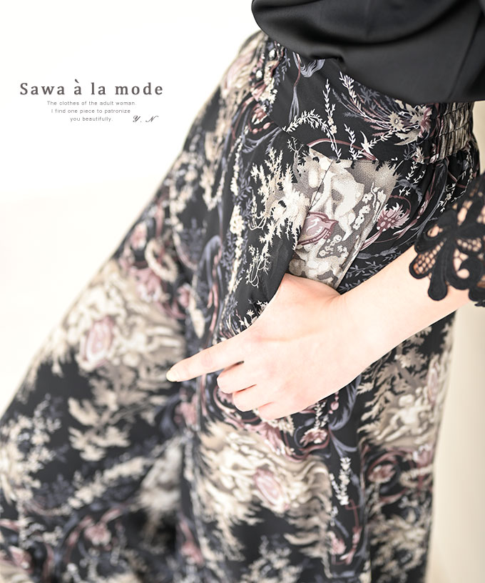 天使とボタニカル柄ハイウエストワイドパンツ レディース ファッション パンツ ブラック 花柄 ロング 春 夏 秋 ウエストゴム M L Mサイズ Lサイズ 9号 サワアラモード アラモード sawaalamode 可愛い服 otona kawaii かわいい服 かわいい 可愛い