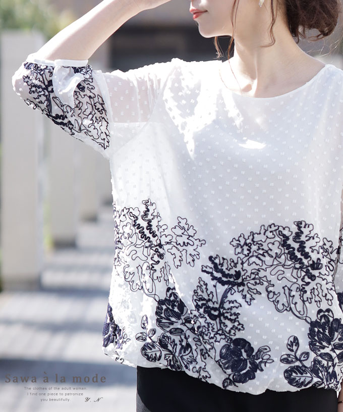 ボタニカル刺繍の7分袖シアーブラウス レディース ファッション トップス ブラウス ホワイト 草木 刺繍 透け感 7分袖 春 夏 秋 M L Mサイズ Lサイズ 9号 サワアラモード アラモード sawaalamode 可愛い服 otona kawaii かわいい服 かわいい 可愛い